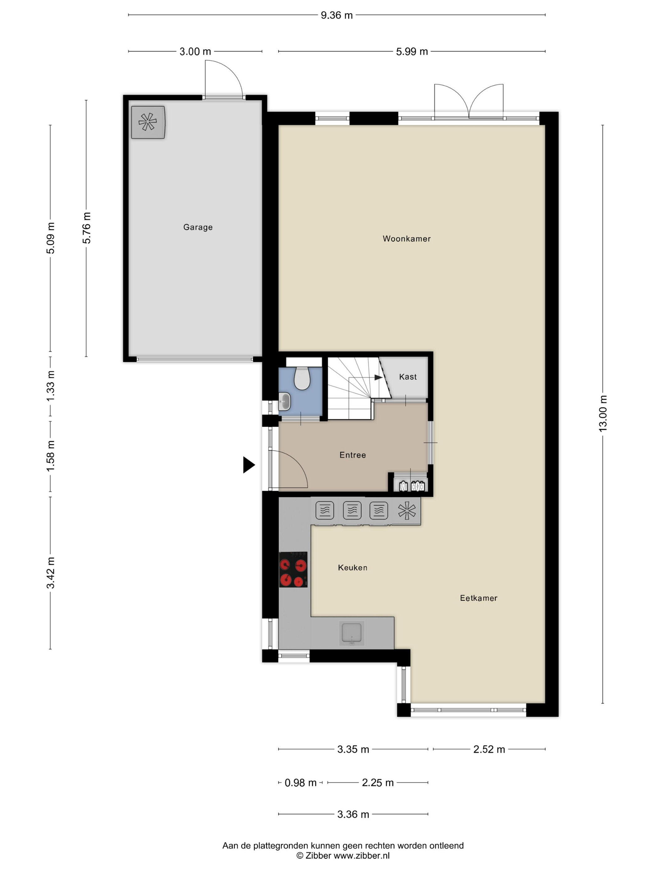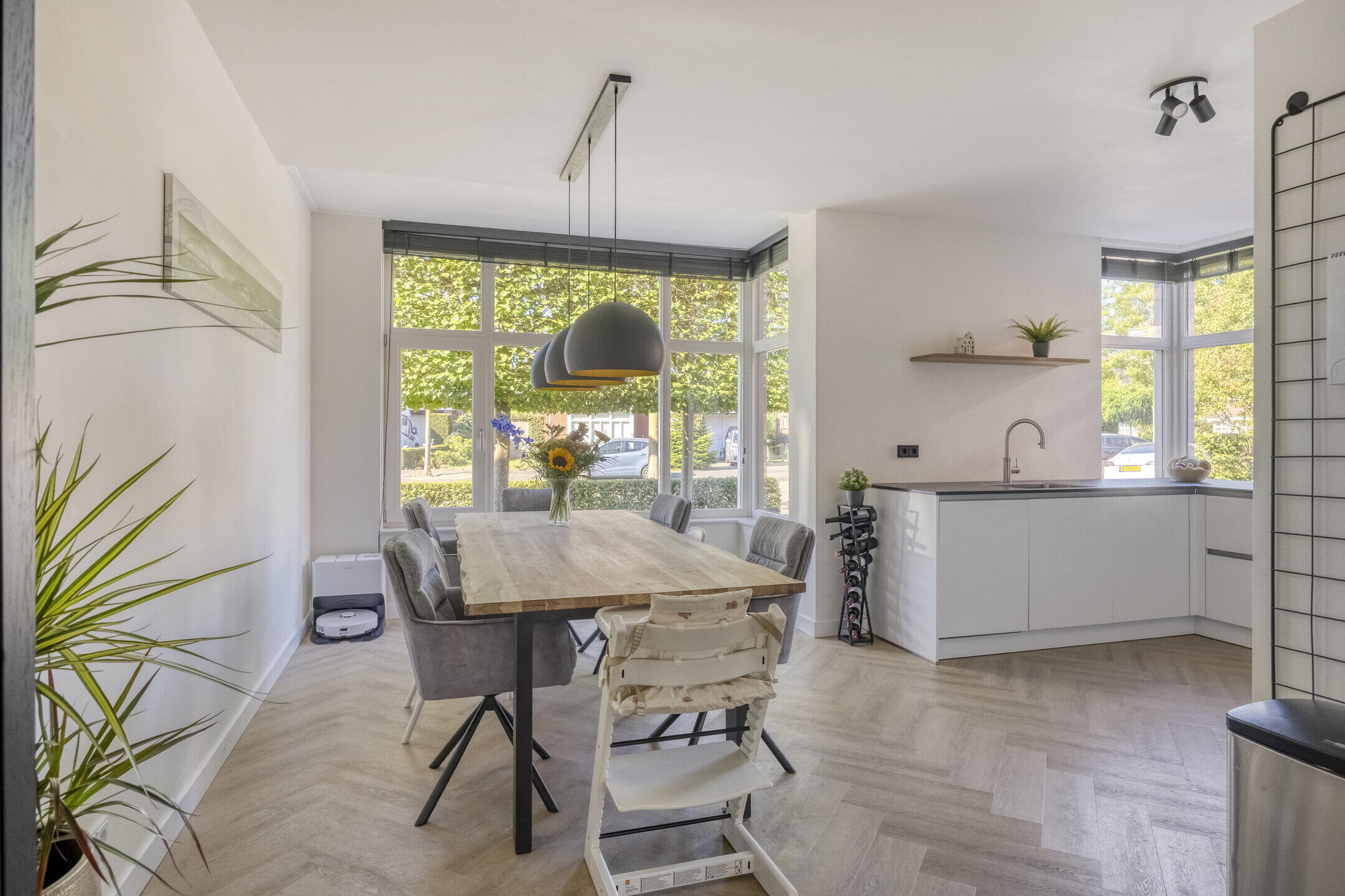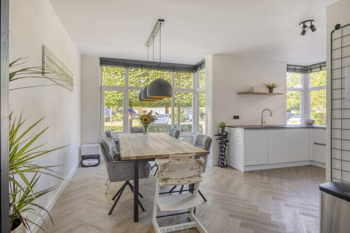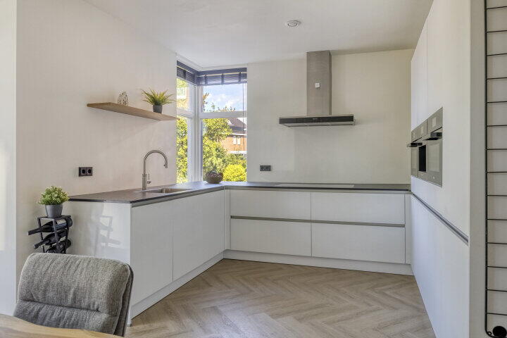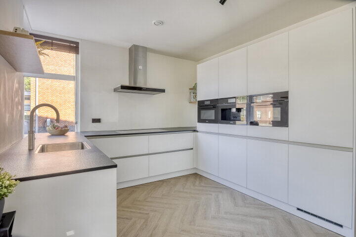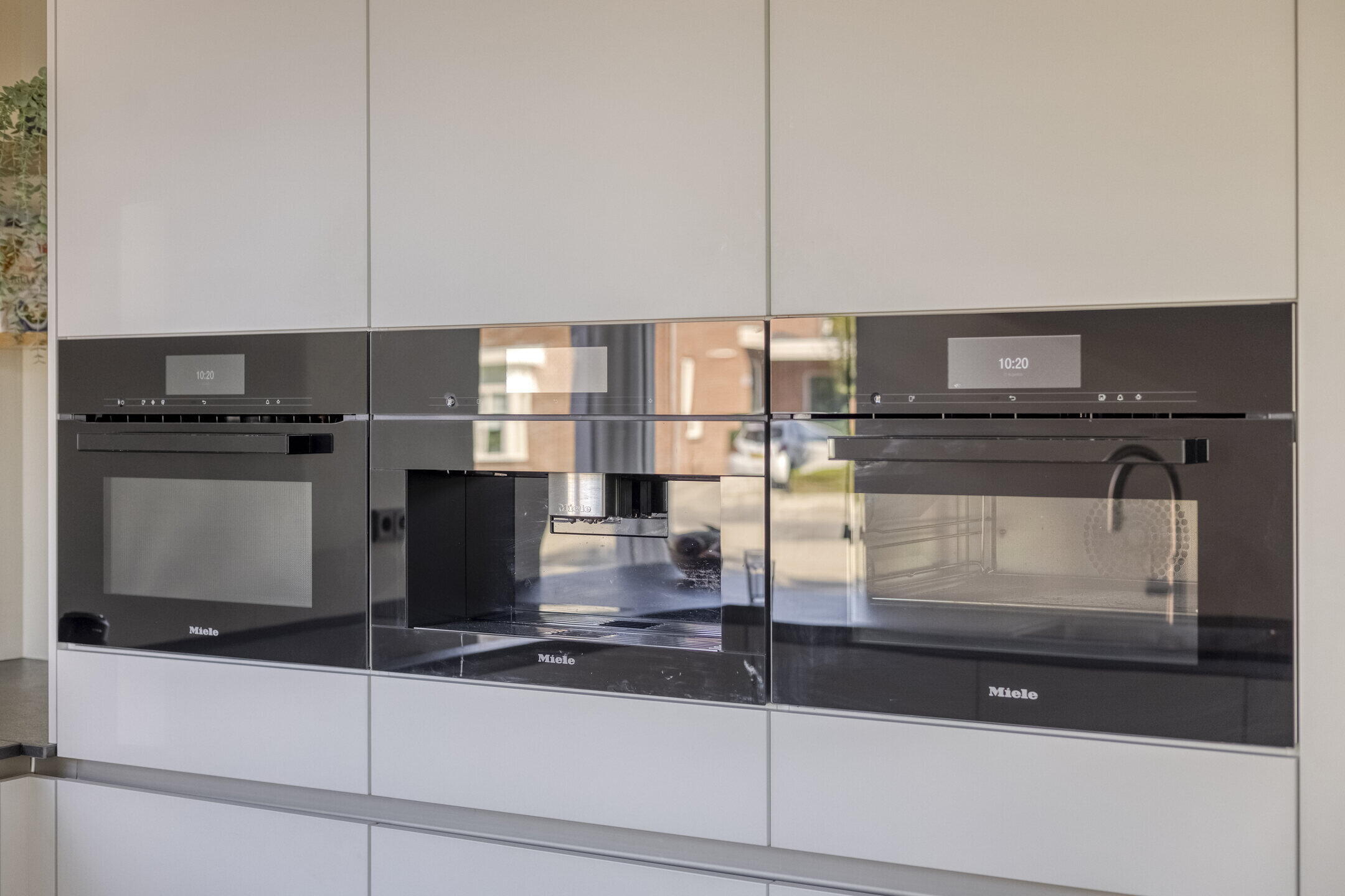 Aan de voorzijde bevindt zich de luxe woonkeuken. De erker en raampartijen maken de ruimte heerlijk licht, en ook hier tref je dezelfde vloer met vloerverwarming. De keuken biedt voldoende ruimte voor een grote eettafel. Verder nog uitgebreide inbouwapparatuur: een inductiekookplaat, vaatwasser, combi-oven, stoomoven, koffiezetapparaat, quooker, koelkast, vriezer en afzuigschouw. Alle apparaten zijn van het merk Miele.