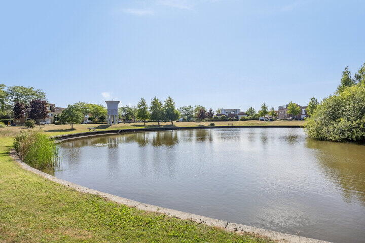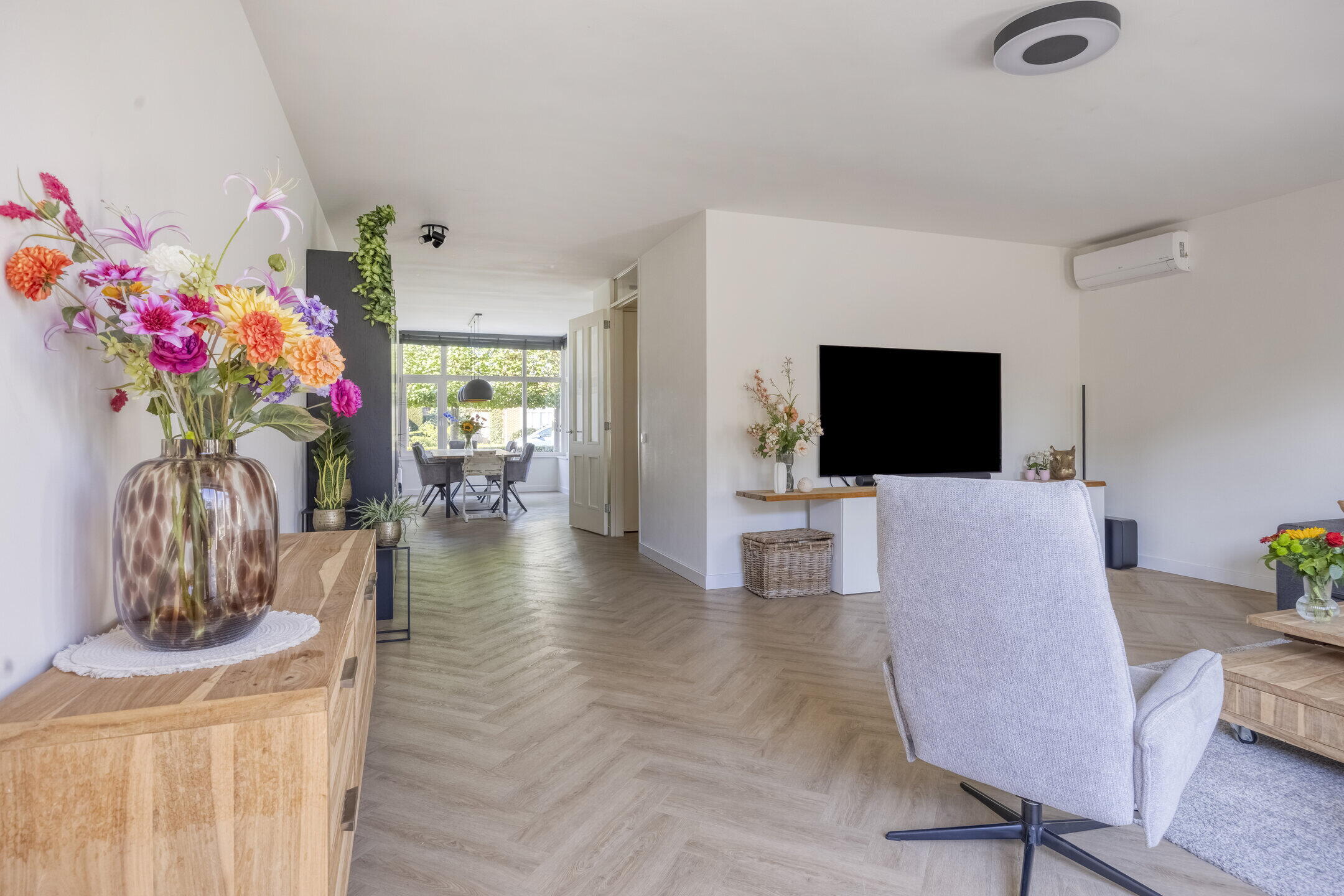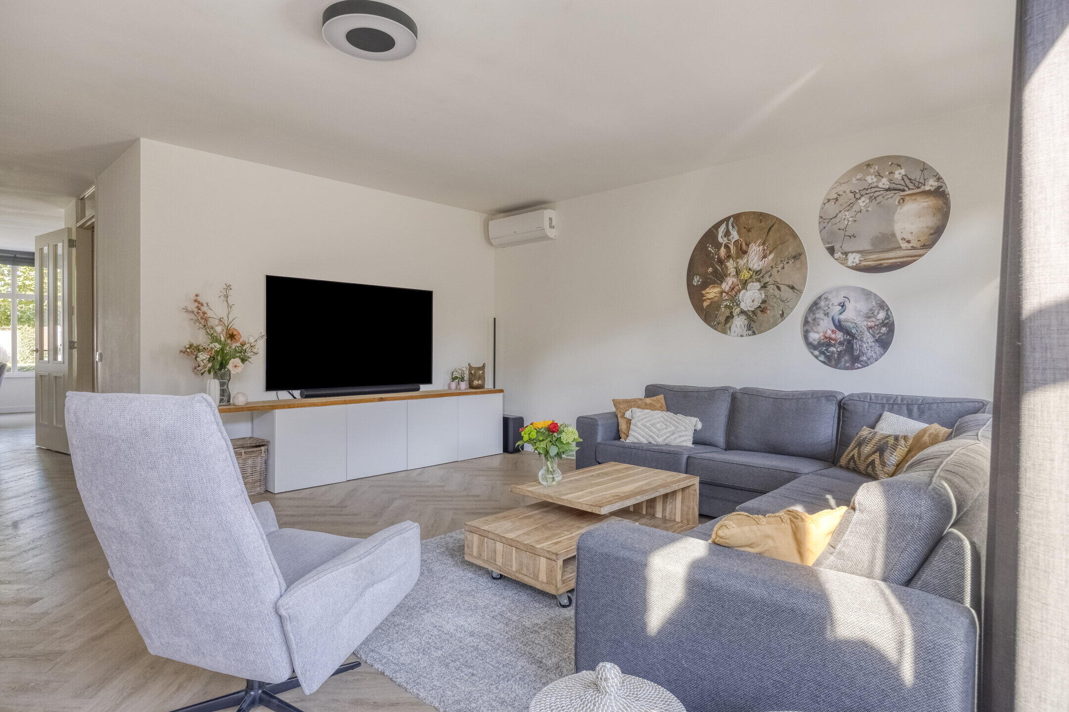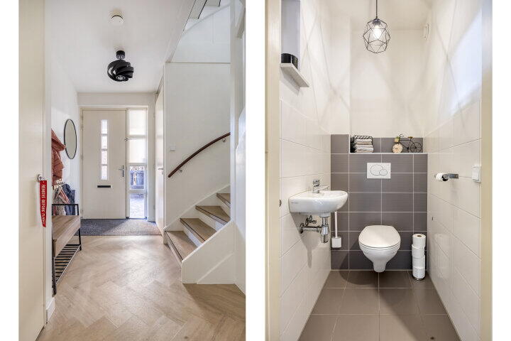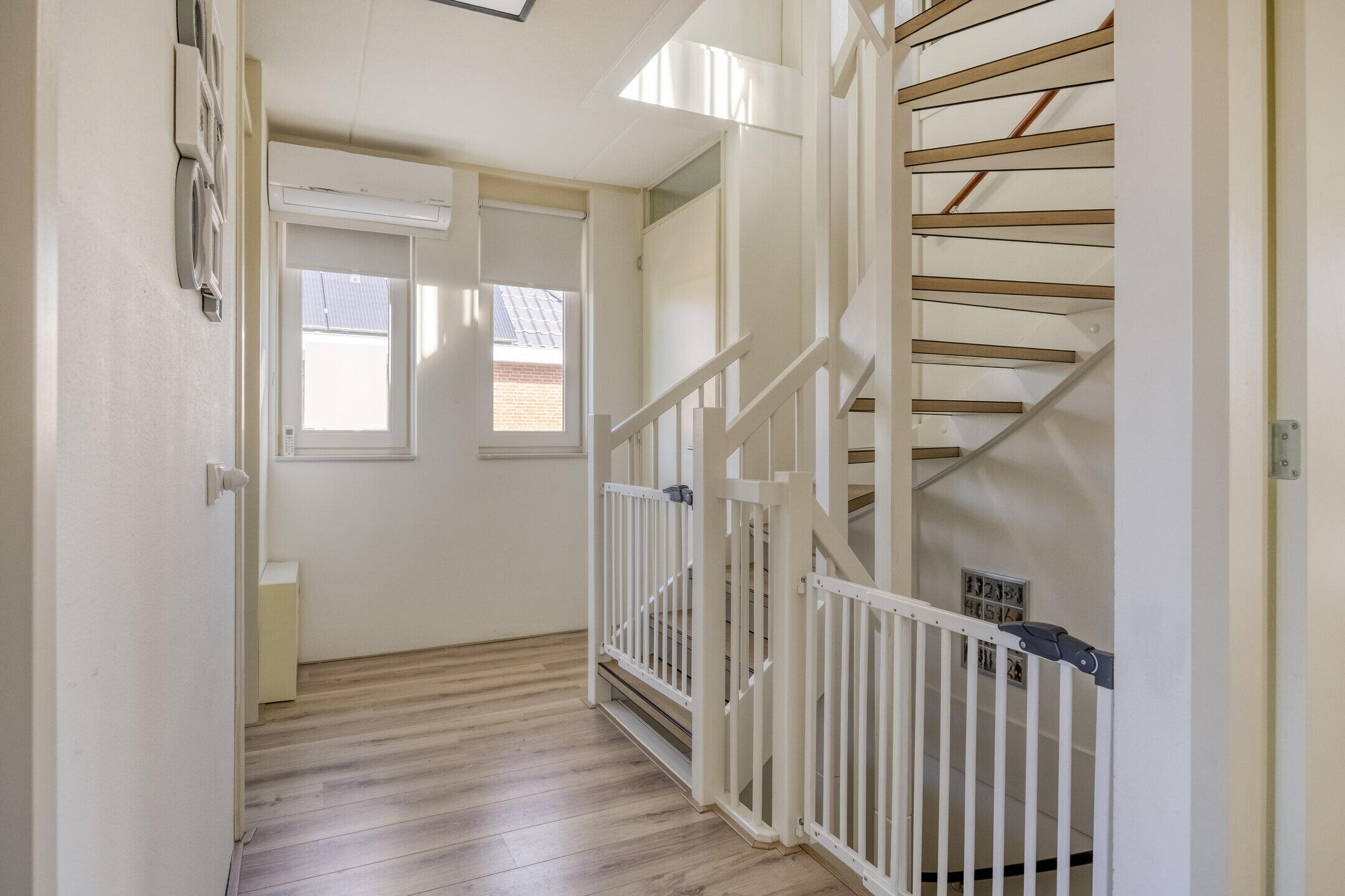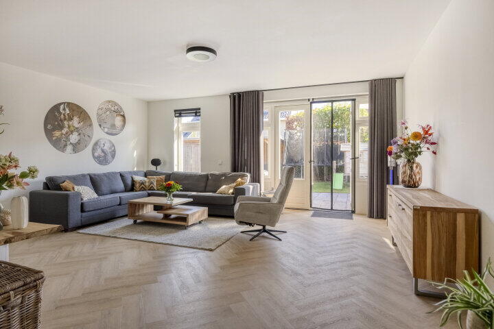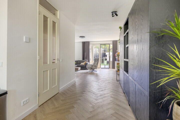 Je betreedt de woning via de hal met meterkast, garderobe, nette toiletruimte, trapopgang naar de eerste verdieping. De woonkamer is gesitueerd aan de achterzijde en kijkt via openslaande deuren uit op de tuin. De living is afgewerkt met een pvc vloer met vloerverwarming, strak gestucte wanden en plafonds en een airco.