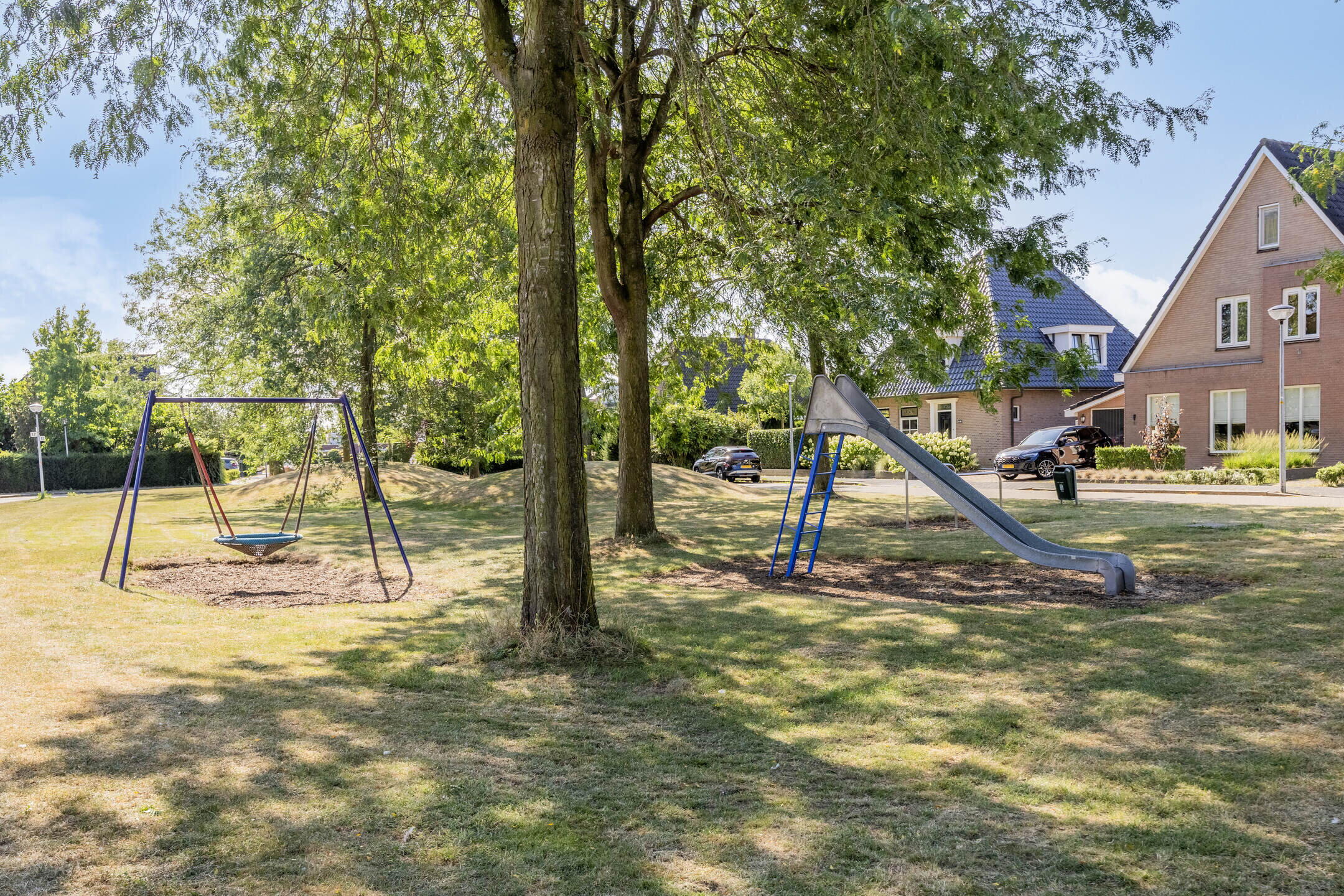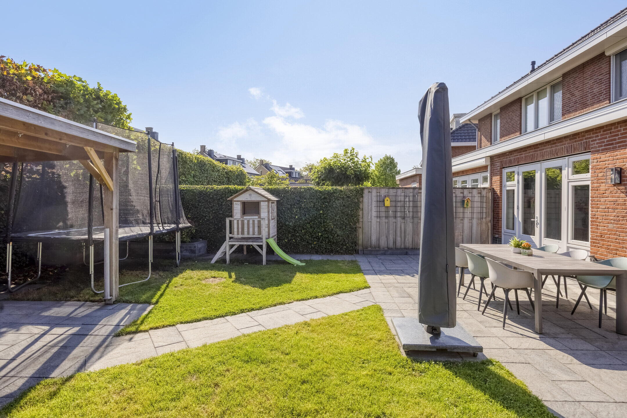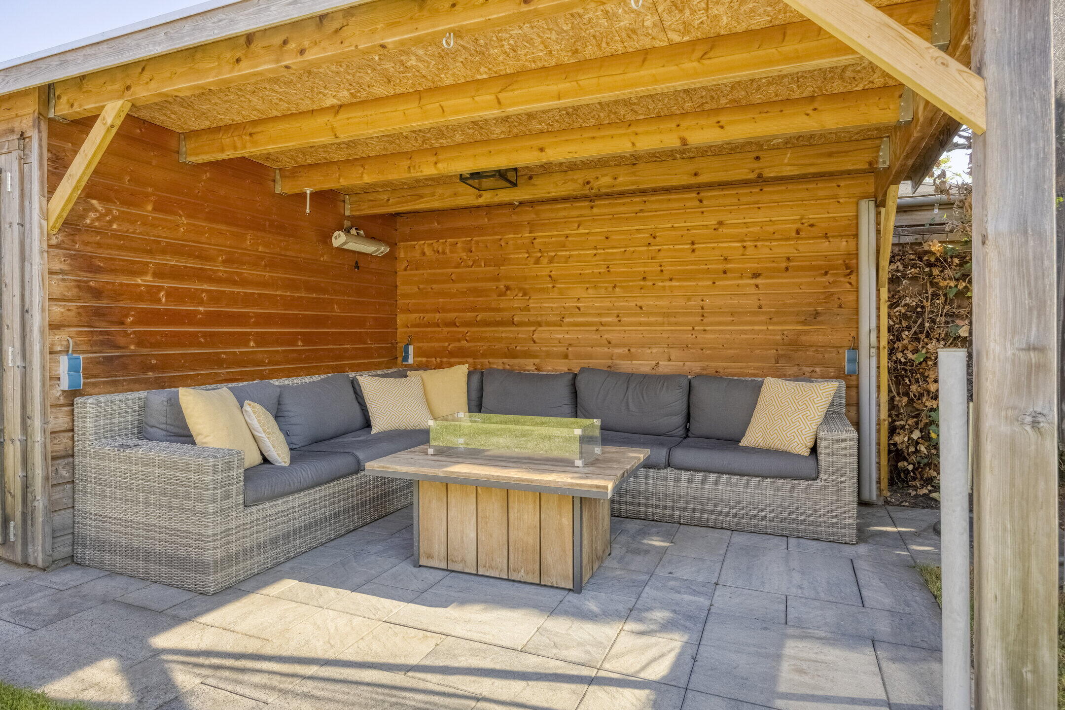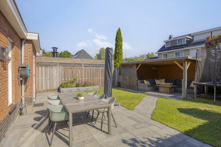 Tot de woning behoort een ruime buitenruimte. De voortuin is netjes aangelegd en op de oprit is parkeergelegenheid voor meerdere auto’s. De achtertuin is gesitueerd op het oosten, zodat je hier al vroeg op de dag van de zon kunt genieten. De tuin is grotendeels bestraat en daarnaast voorzien van gras, beplanting en een ruim terras. Achterin bevindt zich een mooie overkapping waar je het hele jaar van kunt genieten. Aangrenzend bevindt zich de ruime garage, voorzien van een elektrische deur.
